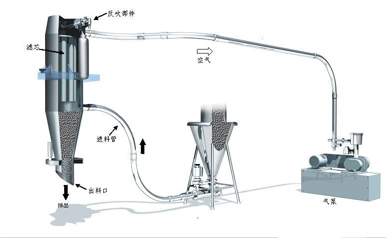 下圖從左往右一次是真空上料機,待輸送物料,真空氣源真空上料機是粉體輸送系統的真空輸送裝置,借助于真空發生源產生高真空形成的負壓氣流,輸送顆粒和粉末狀物料的設備。