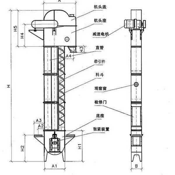 斗式提升機(jī)由料斗、驅(qū)動(dòng)裝置、頂部和底部滾筒 (或鏈輪)、膠帶 (或牽引鏈條)、張緊裝置和機(jī)殼等組成。