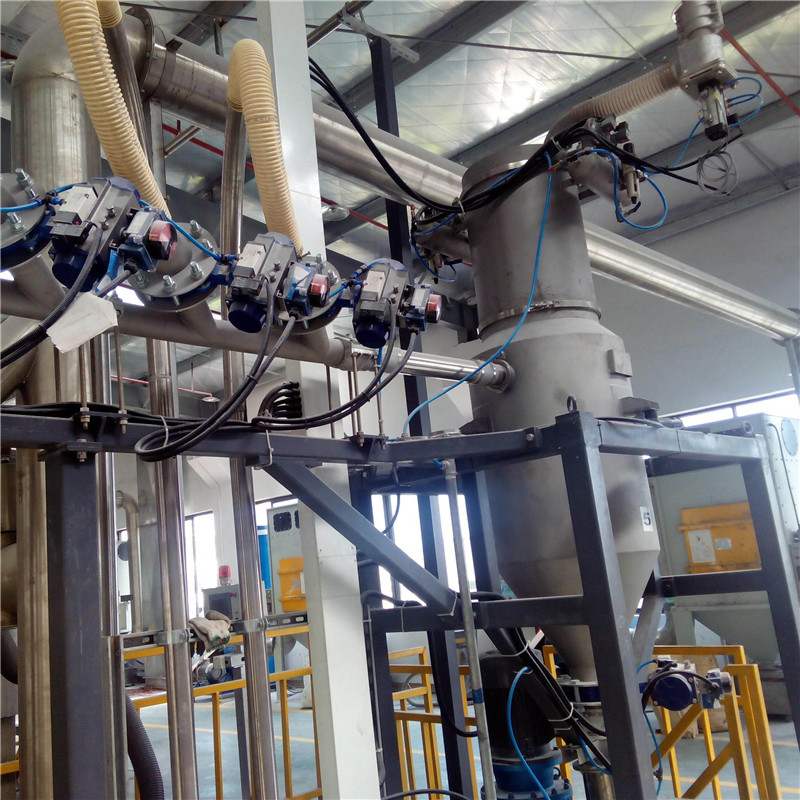 多組份吸料計量稱,主要由截氣閥、過濾器、進料閥組、稱重模塊、脈沖反沖裝置、卸料閥、儲料倉等組成。多組份吸料計量采用負壓平衡技術(shù),通過真空負壓將物料吸到儲料倉內(nèi),在吸料的同時對物料進行計量,根據(jù)物料(粉末)的流動性,可增設(shè)破拱裝置以助流,可以最多20個管道同時接入該計量稱進行計量。精度:±200g或±3‰
