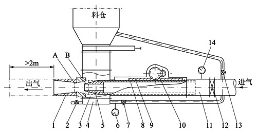 結(jié)構(gòu)包括:1.擴(kuò)散管;2.清灰閥;3.泵體;4.下進(jìn)氣箱;5.風(fēng)嘴;6.壓力表;7.進(jìn)氣閥;8.噴射管;9.齒條;10.調(diào)整裝置;11.進(jìn)氣接管;12.止回閥。